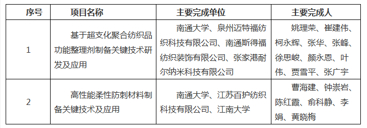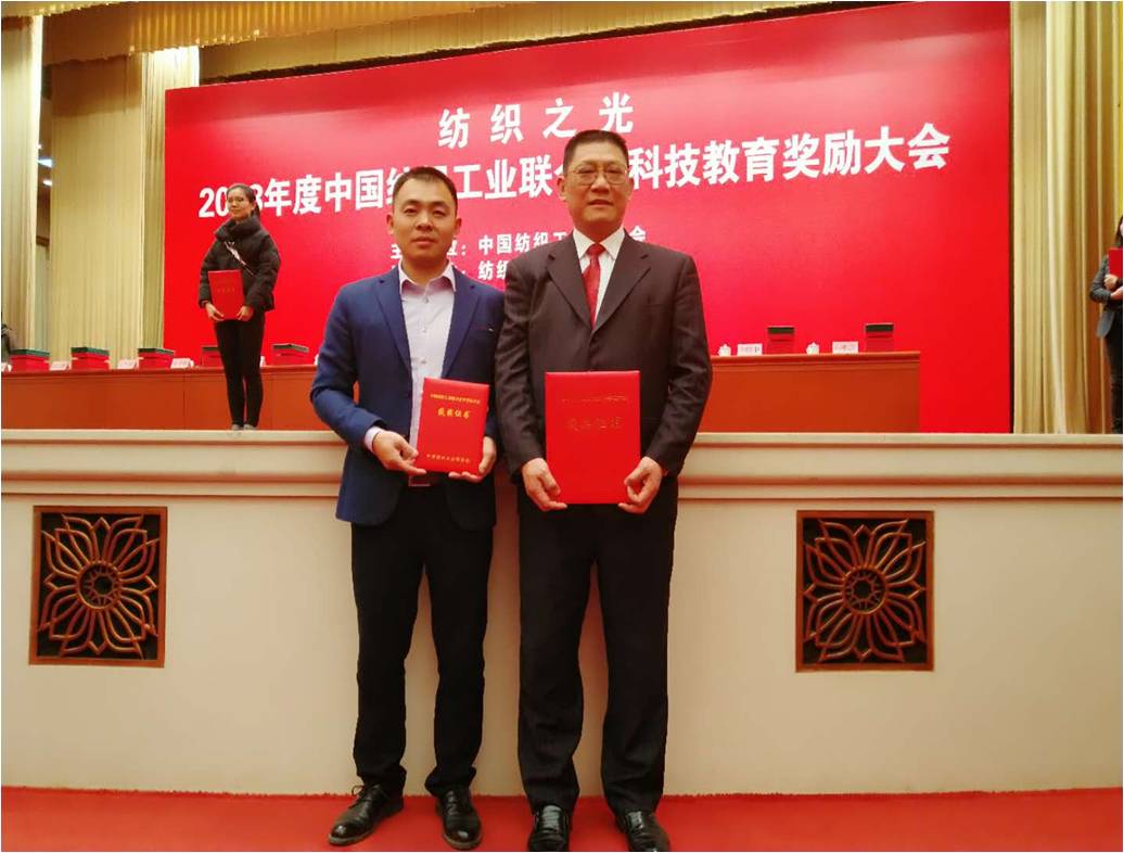 12月5日,“纺织之光”2018年度中国纺织工业联合会科技教育奖励大会在北京人民大会堂举行。会上表彰了“纺织之光”2018年度中国纺织工业联合会科学技术奖,我院2个项目获奖。姚理荣副教授科研团队联合企业合作项目《基于超支化聚合纺织品功能整理剂制备关键技术研发及应用》获2018年度中国纺织工业联合会科学技术进步奖二等奖,曹海建副教授科研团队联合其他高校和企业合作项目《高性能柔性防刺材料制备关键技术及应用》获三等奖。