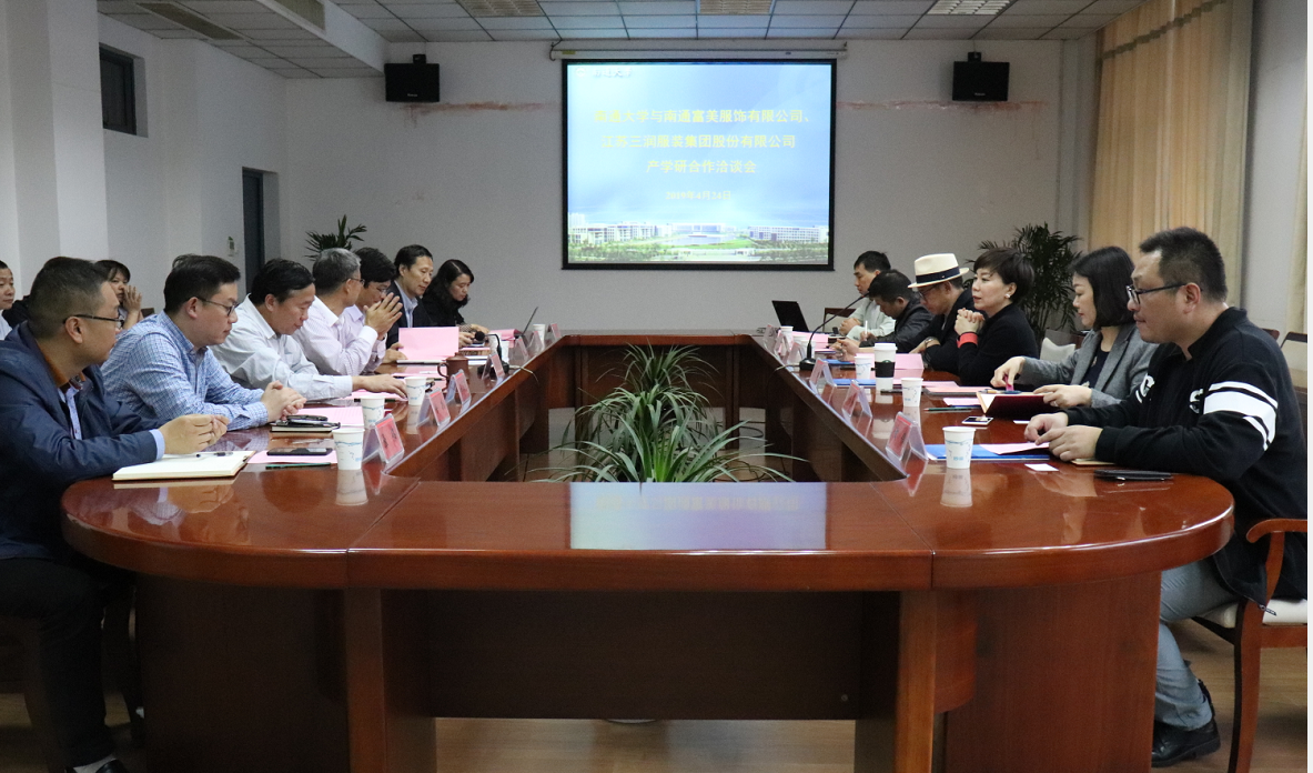 4月24日下午,南通富美服饰有限公司董事长孙建华、CEO李芳和江苏三润服装集团股份有限公司总经理景旭东一行来访,洽谈产学研合作事宜。校党委常委、副校长侯文华出席会议并讲话。