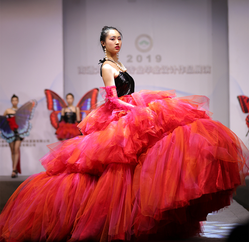 此次展出的23个系列作品是从服装设计与工程、服装与服饰设计专业130份毕业作品中脱颖而出的优秀代表作,涵盖了时尚、复古、民族、传统等多种风格,每个系列的服装都有独特的风格和极具创意的灵感,带有设计师对设计主题独特的理解,充分展示了我校服装专业毕业生的艺术创造力和专业技能,为现场观众带来了一场艺术的视觉盛宴。作品《天马行空》的设计灵感来源于近代中国国画大师徐悲鸿的《战马图》以及唐代画马大师韩干的《牧马图》,在设计过程中,将金文字体诗句与国画奔马的意象融入其中;作品《昼夜》以白昼与黑夜的交替为设计灵感来源,将PVC材质与传统面料相结合;作品《戏台》的设计灵感来源于川剧服饰文化元素,在款式造型上融入了戏服的设计特色,在图案上使用川剧脸谱图案融合戏曲的特色。2019届服装表演专业的同学还带来了16套形象设计的专业表演,赢得了观众阵阵掌声。