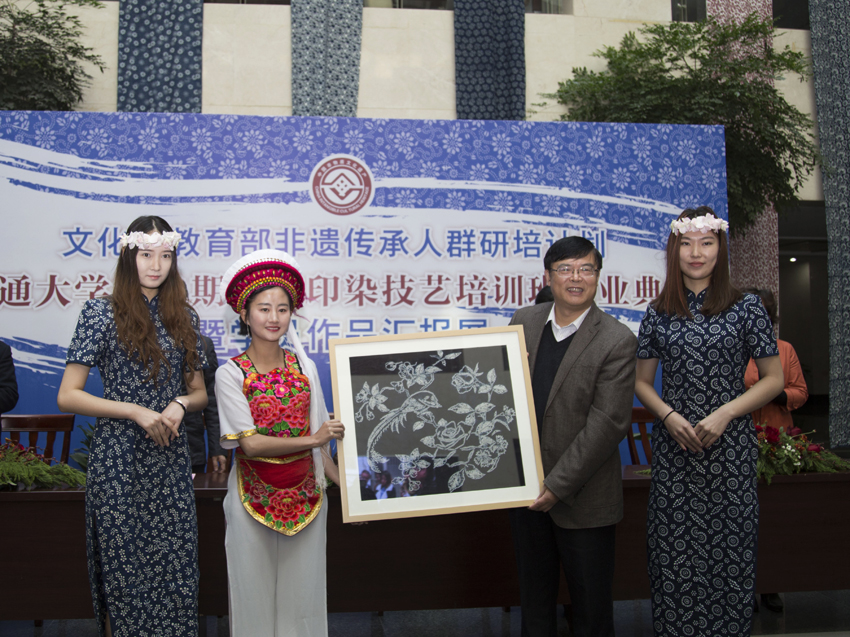 结业典礼上,与会领导为参训学员们颁发了结业证书,学员代表分别向我校捐赠了扎染、捶草印花等艺术作品。