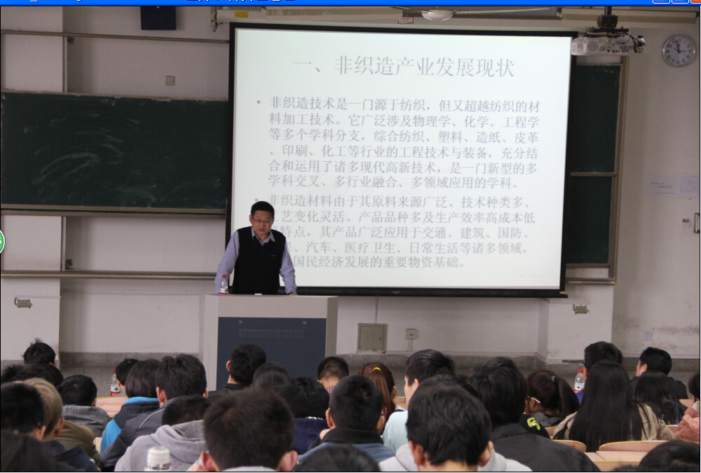 2015年4月15日下午,现任杭州湿法无纺布设备有限公司何忠董事长/高级工程师在南通大学1号楼205会议室为必威手机下载 师生作了题为“湿法非织造布发展方向”的学术报告。报告由必威手机下载 副院长张瑜主持,部分非织造相关企业领导、必威手机下载 非织造材料与工程系全体教师和学生听取了报告会。报告从杭州湿法非织造有限公司的基本情况、湿法非织造产业发展现状及产品应用、非织造企业人才市场需求等几个方面进行了阐述。整个讲座重点突出、内容丰富、数据详实,赢得了师生的一致赞誉。