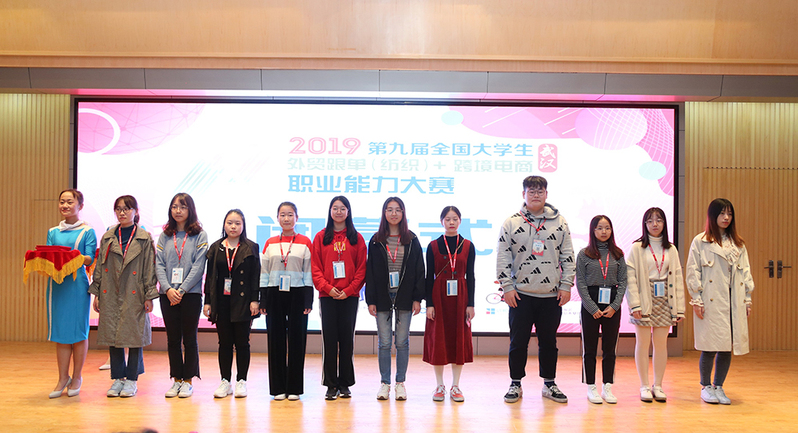 我校学生舒雨霞(左七)在第九届全国大学生外贸跟单(纺织)+跨境电商职业能力大赛中获二等奖。
