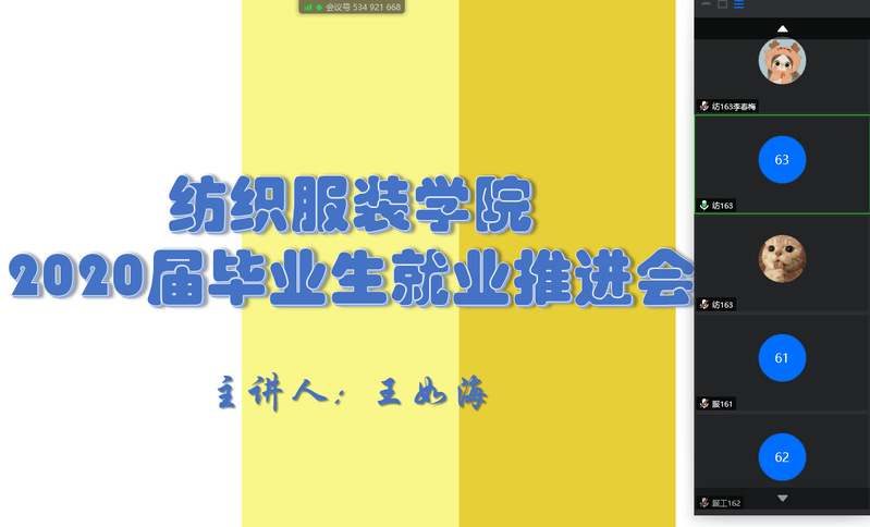 会上,学院副书记、副院长王如海强调了今年就业形势的严峻性,鼓励学生积极参加云就业,运用云平台投递简历、线上面试,获得工作机会。同时,就学院关于就业、实习相关政策作出解读,推进学生进入就业状态。辅导员侯昀彤就当前年级学生的就业情况、研究生考试情况作了简要总结,对就业协议签订、档案投递、协议书上传系统等进行了详细说明。此外,针对疫情防控期间班级管理、宿舍管理作出了明确要求。