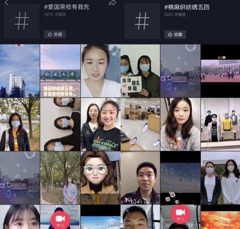 本次活动依托抖音平台,组织纺服通心粉们以“棉麻织纺绣五四,爱国荣校我先来”为话题,通过短视频的方式亮身份、明使命、勇担当,旨在引导广大学子主动传承五四精神、增强爱国荣校意识,积极营造喜迎5.28校庆日、建校108周年的热烈氛围。
