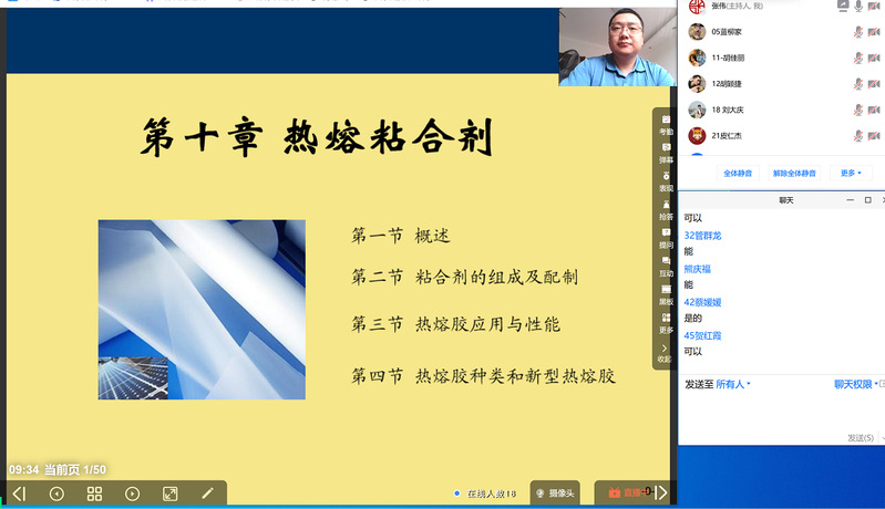 张伟教授通过课堂派、腾讯会议同步网络教学,围绕热熔粘合剂及其在非织造领域的应用等内容展开讲解。学校相关教学考核评估人员、学院相关教师参加线上观摩。大家一致认为,直播课堂准备充分,理论知识与视频内容相结合,课堂回应积极,充分展现了线上教学的能力和特色,确保了防疫期间的教学质量和效果。