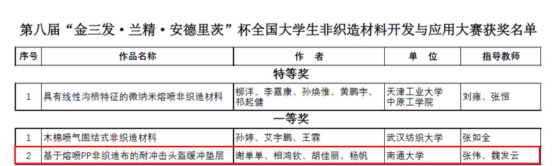 近日,第八届全国大学生非织造材料开发与应用大赛在浙江湖州完成评审工作。我院学生谢单单、相鸿钦、胡佳丽、杨帆的参赛作品《基于熔喷PP非织造布的耐冲击头盔缓冲垫层》获得大赛一等奖,聂渡、朱彧楠、高天硕、莫映红的参赛作品《Janus仿生结构的高效海水淡化非织造复合材料》获二等奖,另有4项作品获三等奖,4项作品获优秀奖,获奖数量在所有参赛高校中排名第二。