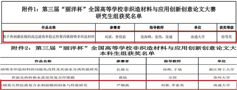 近日,第三届全国高等学校非织造材料与应用创新创意论文大赛完成评审工作。我院研究生刘诺、曾倩茹的参赛作品《基于热刺激驻极的高过滤效率稳定性聚丙烯熔喷非织造材料》获得大赛研究生组特等奖,严柳燕同学的作品《木棉基天然抗菌复合水刺面膜的制备与性能研究》获本科生组一等奖,另有2项作品获二等奖,2项作品获三等奖。