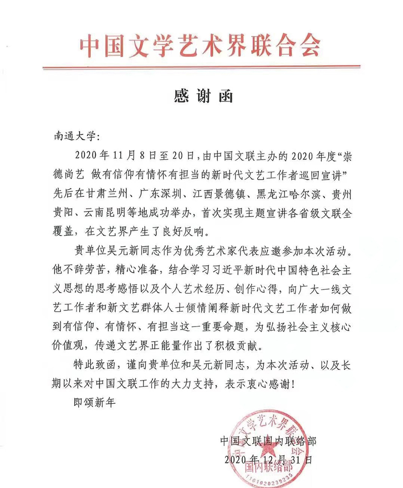 12月31日,中国文学艺术界联合会向我校发来感谢函,充分肯定了我院吴元新研究员在中国文联举办的2020年度“崇德尚艺 做有信仰有情怀有担当的新时代文艺工作者巡回宣讲”中的精彩表现,向我校以及吴元新研究员对本次活动的大力支持表示衷心感谢。