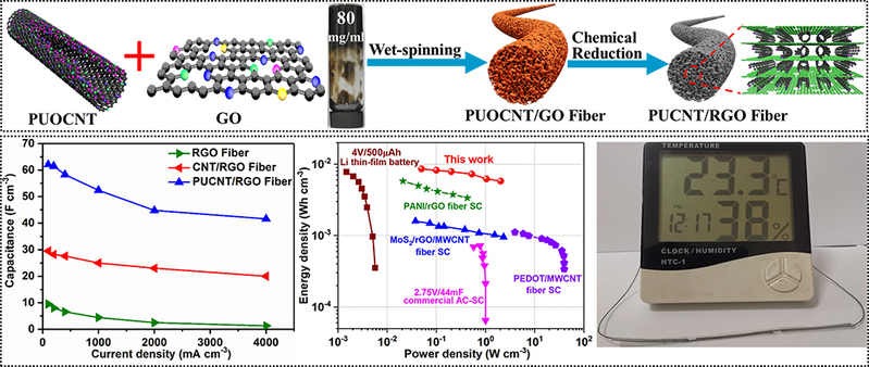 该研究以部分剥离的碳纳米管为增溶剂提高了氧化石墨烯的溶解性,从而获得了高浓度的纺丝液;在纺丝过程中减少了双扩散中的传质,因此减少了隔离的、不连续孔(死体积)的形成。以该纤维为柔性电极构建的纤维状固态超级电容器具有优异的电化学性能,其体积能量密度达到了8.3 mW h cm-3,超过了先前报道的碳基纤维;并且具有好的循环稳定性和机械稳定性。该研究成果为精细控制石墨烯基纤维的密度和孔隙结构提供了一种高效、可规模化的方法。