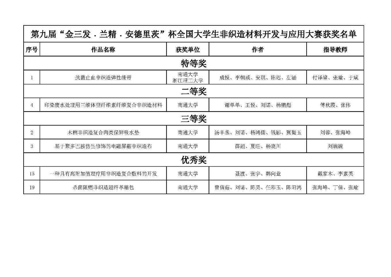 全国大学生非织造材料开发与应用大赛是非织造专业领域最具权威的赛事。本次大赛由中国纺织服装教育学会、中国产业用纺织品行业协会主办,浙江金三发基团有限公司、兰精纤维(上海)有限公司、ANDRITZ Perfojet SAS冠名协办。经专家评审,本次大赛共评出特等奖1项、一等奖2项、二等奖7项、三等奖24项、优秀奖26项。(张广宇)