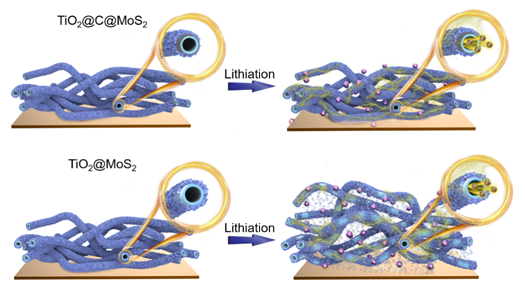此外,葛明政教授在化工领域国际顶级期刊《Chemical Engineering Journal》上(JCR一区,IF=13.273)发表了题为“Interfacial Reinforcement Structure Design towards Ultrastable Lithium Storage in MoS2-based Composited Electrode”(Chem. Eng. J., 2021, 416, 129094)的研究论文。为了克服二硫化钼(MoS2,理论容量为670 mAh g-1)电导率低和体积膨胀率大等缺点,在二硫化钼和二氧化钛中间引入碳层,制备了核壳结构TiO2@C@MoS2纳米复合物,并通过界面增强结构设计来稳定二硫化钼电极。该方法还提高了MoS2的导电性,以及锂离子在MoS2表面和MoS2与TiO2界面间的吸附性能。这种独特的界面增强结构为设计其他大容量电极材料提供了宝贵的经验。