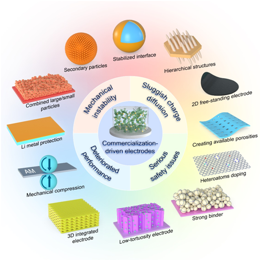 随着各种电子产品、电动/混动汽车以及智能电网等技术的飞速发展,对高能量密度以及低成本的锂离子电池需求越来越大。然而,目前传统锂离子电池的能量密度(≤ 300 Wh/kg)已经无法满足在大规模储能等领域的需求。因此,提高锂离子电池电极材料单位面积负载量是提高能量密度的方法之一。但是,电极负载量的增加也带来了一系列问题,比如缓慢的电化学反应动力学和电极的机械不稳定性等。本论文综述了大载量电极的设计原理和制备工艺的最新进展,包括结构设计(二次颗粒结构、低弯曲度结构、多孔结构和集流体/电极材料复合结构设计等)、界面工程(粘结剂和电解液设计等)和机械压缩策略等,从而提高电池的能量密度、电池稳定性和耐久性。论文对今后的大载量电极的研究和发展提供了宝贵的经验。