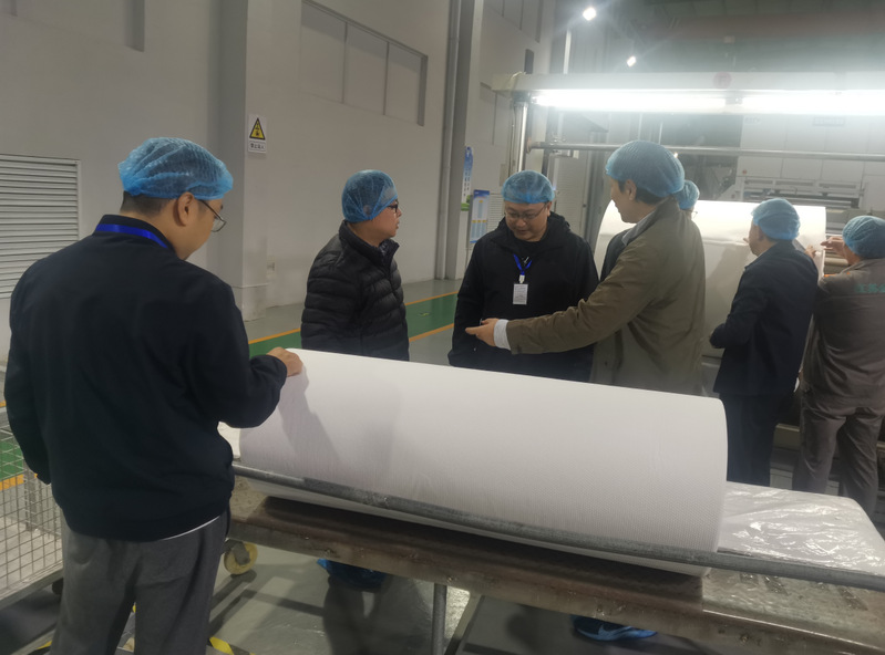 在江苏金三发公司,考察团一行得到了公司孙信董事长,王松总经理等企业负责人的热烈欢迎,并介绍了企业发展历程和项目状况,带领大家参观了湿法水刺布生产车间、培训场地等。