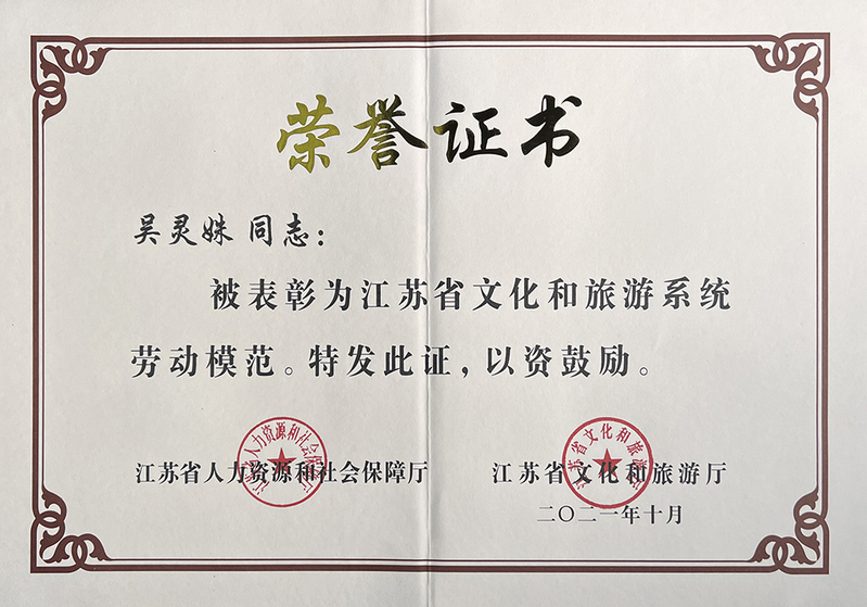 近日,江苏省文化和旅游系统先进集体、先进工作者和劳动模范名单公布,我院教师吴灵姝被表彰为“江苏省文化和旅游系统劳动模范”。