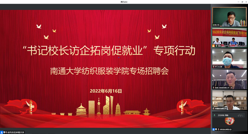 樊小东对与会单位表示热烈欢迎和衷心感谢,介绍了学校发展历程、办学理念、毕业生就业等情况。他表示,2022届高校毕业生规模首次突破千万,受多重因素影响,就业形势严峻复杂,此次把企业“请进来”,希望能借此机会与企业开展多领域、全方位合作,促进毕业生充分就业,助力企业高质量发展,实现双方共建、共赢、共享。他指出,高校与用人单位是处于人才供需链两端的命运共同体,学校将进一步深化与用人单位的深层次合作,在人才需求、招聘计划等方面深入沟通,深化教育教学改革,不断优化人才结构,满足用人单位不同专业的人才需求;进一步了解用人单位对毕业生的满意度,根据用人单位意见反馈,超前布局和动态调整学科专业,进一步强化专业内涵建设,提升毕业生解决实际问题能力,满足用人单位对人才的能力需求;进一步发挥纺织人才培养主阵地作用,坚持以“岗位胜任力”为导向,提升教育教学水平,持续深化纺织人才培养模式综合改革,为推动纺织行业发展、服务国家战略大局作出更大的贡献。