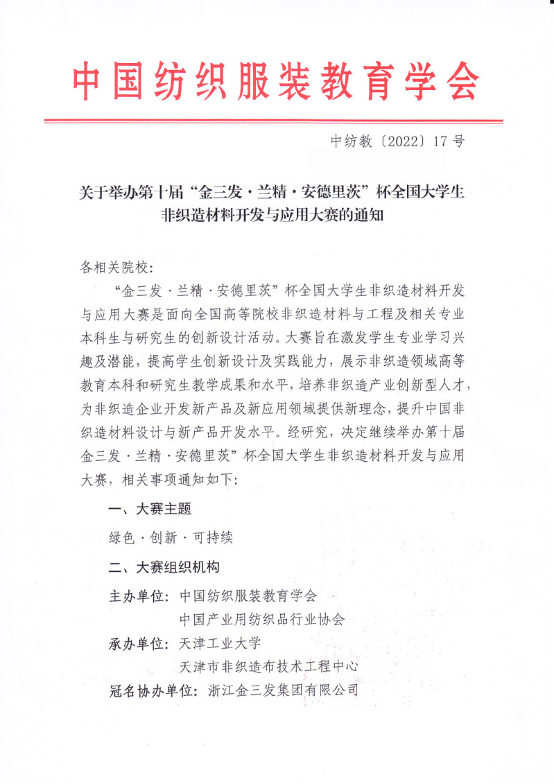 关于举办第十届“金三发·兰精·安德里茨”杯全国大学生非织造材料开发与应用大赛的通知