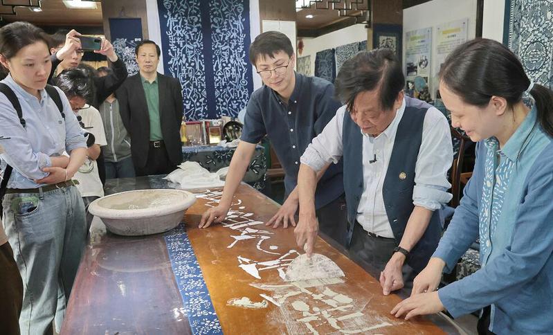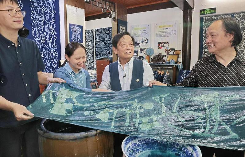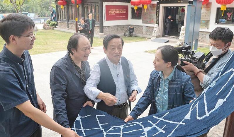在蓝印花布艺术研究所,韩美林与我校蓝印花布艺术研究所研究员吴元新、吴灵姝等非遗传承人一起画样、刻版、刮浆、染色,展示蓝印花布印染技艺。