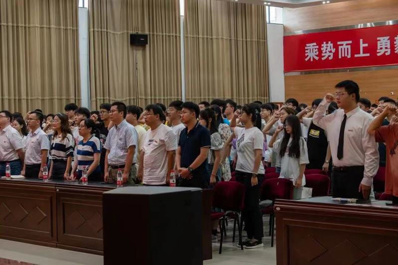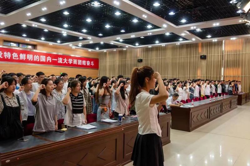 会上,全体2023级新生庄严宣誓:将时刻铭记祖国的复兴大业,铭记人民的幸福向往,铭记师长的谆谆教诲,铭记父母的深切期望,铭记自己的初心梦想,遵法守纪、明礼诚信,忠实不欺、力求精进,秉承张謇爱国精神、做好张謇纺织传人,强国有我,请党放心。院学生会副主席、表演201班王璐琳领誓。